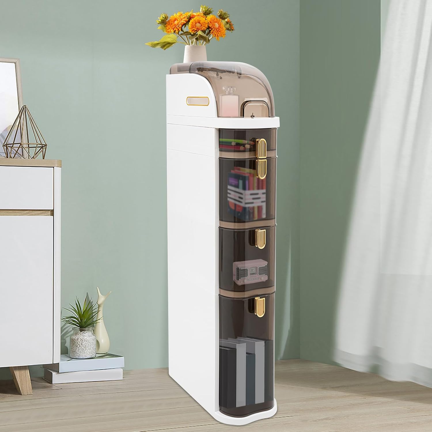 DetailsToilet Paper Holder: It allows you to easily extract tissues without opening the lid. Moreover, it can also serve as a handle to facilitate moving this item.Practical Wheels: Four wheels at the bottom allow you to easily move the product to a suitable position, and it is removable, which you can choose to install or not.Smooth Edge: The smooth edges not only add to the aesthetics of the storage cabinet but also improve the safety of use.ApplicationThis 4-tier storage cabinet is suitable for a bedroom, kitchen, dining room, bathroom, living room, laundry room, office, closet, etc. for organizing clothes, kitchen utensils, sundries, books, files, snacks, and so on.SpecificationMaterial: PP, PC, ABSProcess: Injection Molding, ElectroplatedColor: White, Clear BrownStyle: ModernShape: RectangularMount Type: Free StandingAssembly Required: YesIndoor/Outdoor Usage: IndoorNumber of Items: 1Number of Drawers: 4Large Drawer Height: 34.5 cm/ 13.58 inEach Medium Drawer Height: 20 cm/ 7.87inSmall Drawer Height: 9 cm/ 3.54inMaximum Load Capacity(Total): 10kg/ 22.05 lbsProduct Size: 41*18*98 cm/16.14*7.09*38.58 inPackage Included1* 4-Tier Storage Cabinet4* Wheels