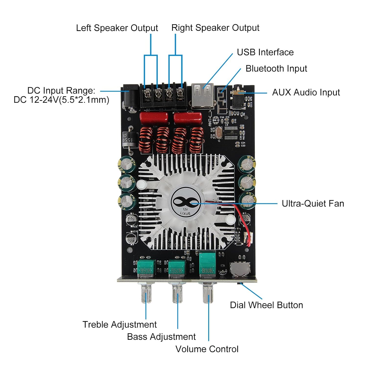 Name: ZK-1602T Amplifier ParametersPower Amplifier Chip:TDA7498EInput Voltage: DC 15V-36VMax Power Output: 160W+160WInput Method: Bluetooth & AUXChannel: 2 CH Stereo OutputOutput Impedance:4-8ΩBluetooth Version:BT 5.0Protection Mechanism : over-voltage, under-voltage, over-temperature, short-circuit, and anti-reverse connection protection